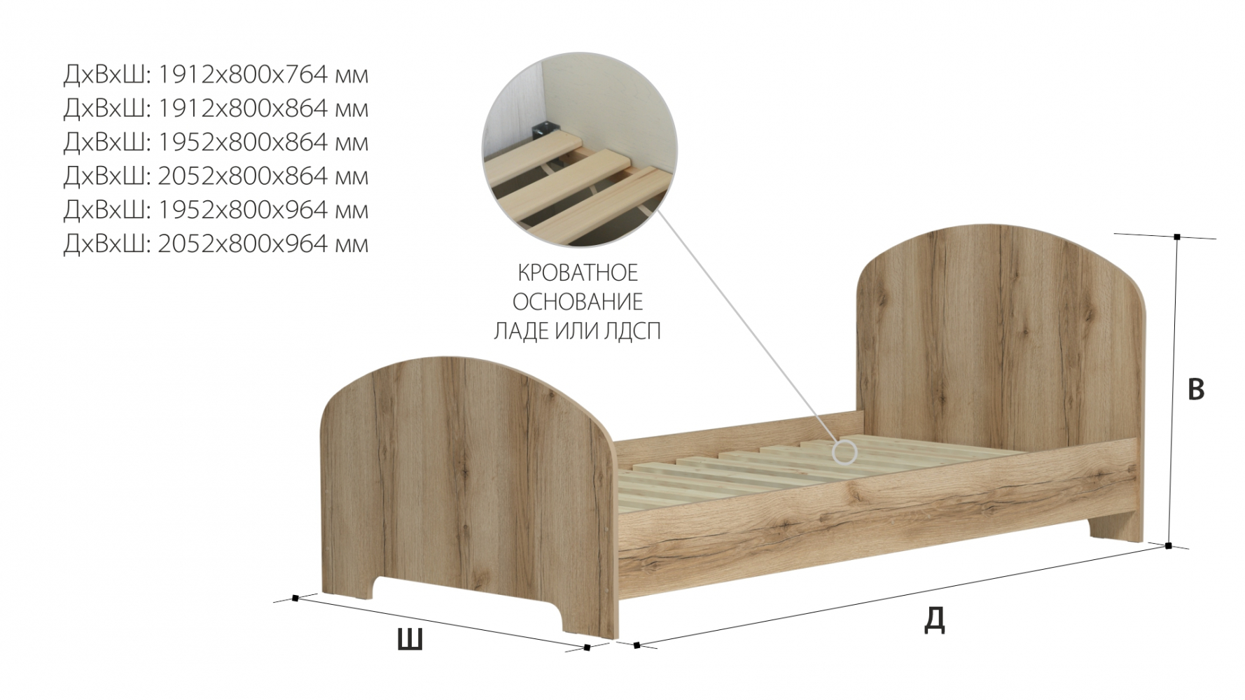 Спальное место 2000х800 ДхВхШ: 2052х800х864 мм.